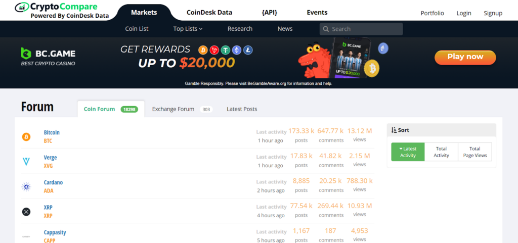 Engagement on CryptoCompare forums is moderate, with a greater emphasis on reviews and analytics than on real-time chatter. Forums are organized by coin and exchange, allowing for targeted discussions. Users can create threads, comment, like/dislike posts, and follow specific topics.