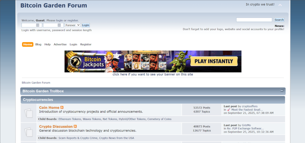 Bitcoin Garden is a long-standing crypto forum known for its grassroots vibe and broad topic coverage. Its audience includes crypto beginners, altcoin enthusiasts, bounty hunters, founders of small projects, users interested in giveaways, airdrops, mining, trading, and promotional campaigns. It appeals to a global audience with a strong DIY and community-driven ethos.