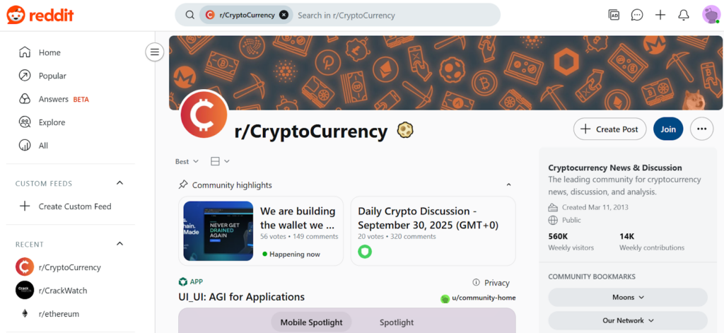 3. Reddit (r/CryptoCurrency, r/CryptoMarkets, r/Altcoin)