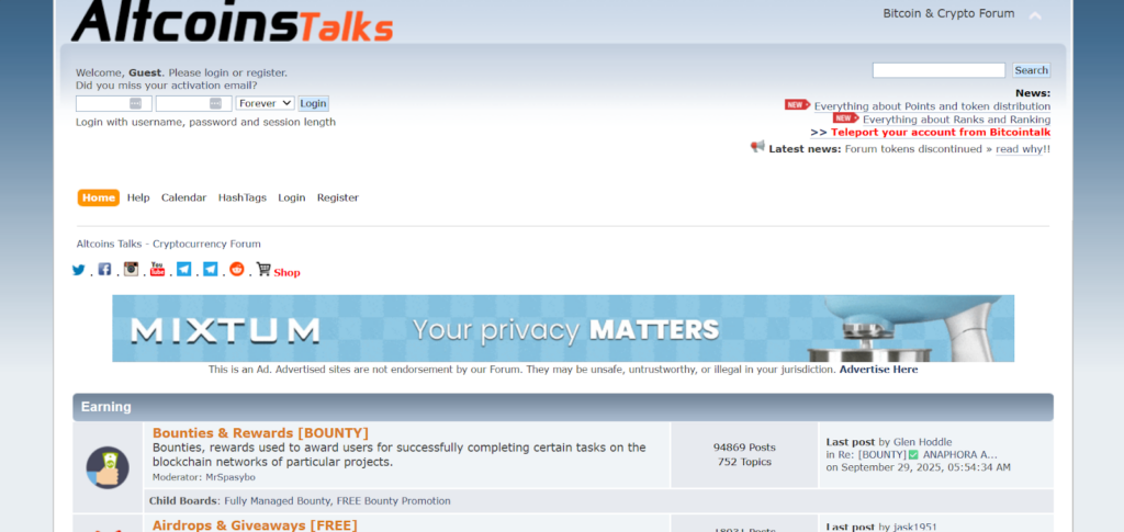 Engagement on AltcoinTalks is transactional but consistent, especially around new launches. It always has high activity in bounty sections, token announcements, and airdrop threads.