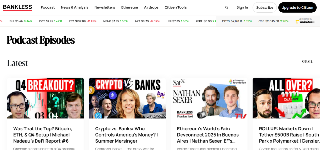 Frequency: Multiple episodes per week. Includes interviews, rollups (weekly news recaps), and deep dives into crypto trends.