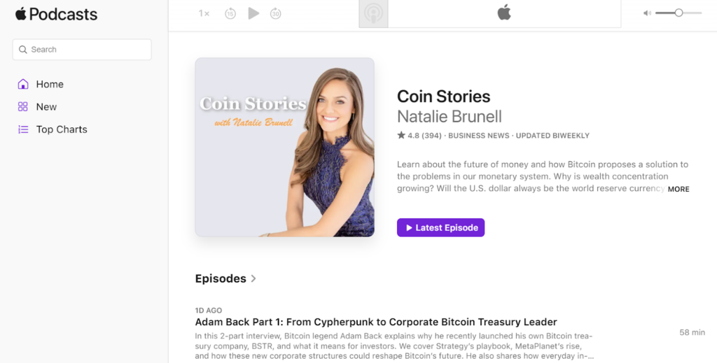 Host(s): Coin Stories Podcast is hosted by Natalie Brunell, an Emmy-winning journalist, educator, and Bitcoin advocate. Brunell brings a polished, journalistic approach to Bitcoin storytelling and macro analysis.