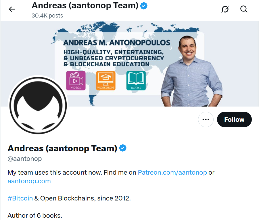 Andreas Antonopoulos is a renowned Bitcoin educator and author of Mastering Bitcoin. He has over 780,000 followers on X (formerly Twitter), where he focuses on Bitcoin fundamentals, blockchain education, and open-source innovation. Antonopoulos is respected for his ability to explain complex technical concepts in simple terms, making him one of the most trusted voices in crypto education.