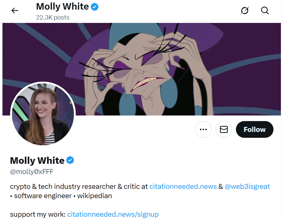Molly White is a researcher, writer, and creator of “Web3 Is Going Just Great,” a project that critically examines the cryptocurrency industry. With more than 124,000 followers on X (formerly Twitter), she discusses the risks, accountability, and challenges facing Web3 projects. White’s skeptical perspective provides a necessary counterbalance, encouraging more responsible innovation and transparency in the space.