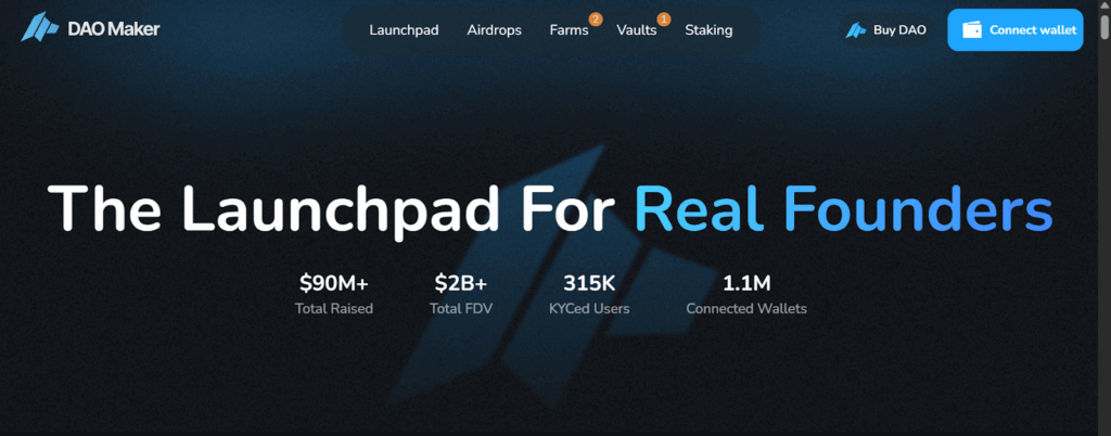 DAO Maker is a blockchain-based crowdfunding and venture platform that connects innovative Web3 startups with a global community of investors. With over 315,000 KYC-verified users and 1.1 million connected wallets, it is one of the most widely used launchpads in the industry.