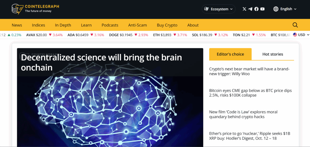 Cointelegraph is known for unbiased reporting and in-depth analysis with a strong focus on blockchain innovation and social transformation. It has a global audience with coverage in multiple languages. Cointelegraph’s strengths include;