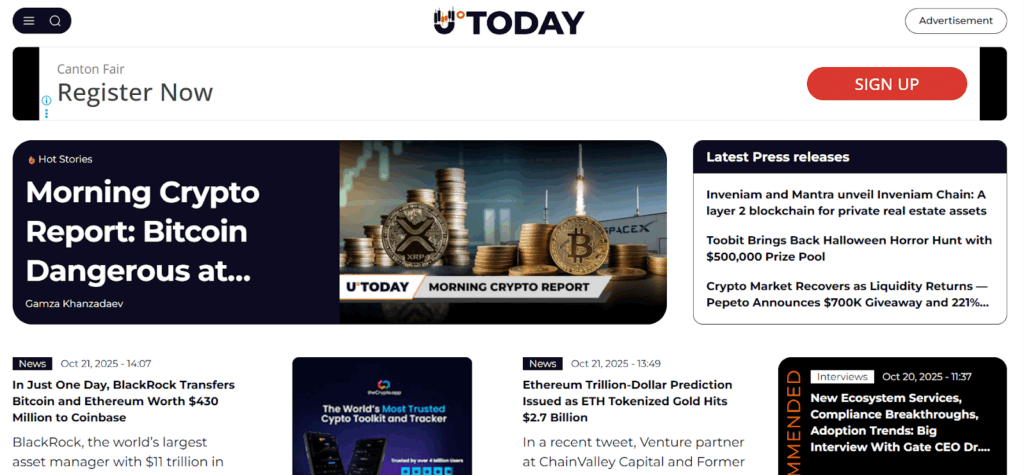 Founded in 2017, U.today, with over 1.7 million monthly visits, is a fast-paced crypto news outlet focused on delivering real-time updates, market analysis, and expert commentary. It covers major cryptocurrencies such as Bitcoin, Ethereum, and XRP, as well as blockchain trends and fintech developments.