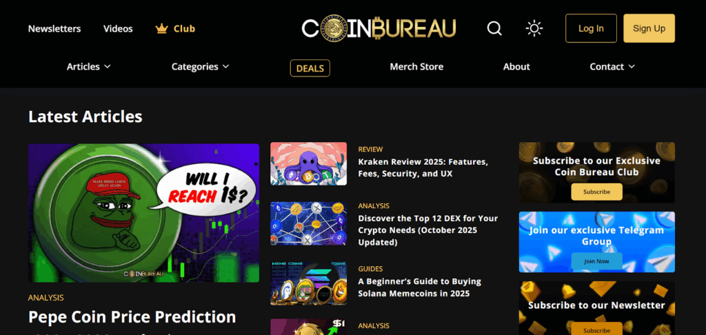 Founded in 2017, The Coin Bureau, with over 1.3 million monthly visits, is a crypto education hub led by Guy Turner. It is known for its in-depth YouTube videos, blog articles, and market explainers. It is designed to help users understand blockchain projects, tokenomics, and crypto trends without hype or jargon.