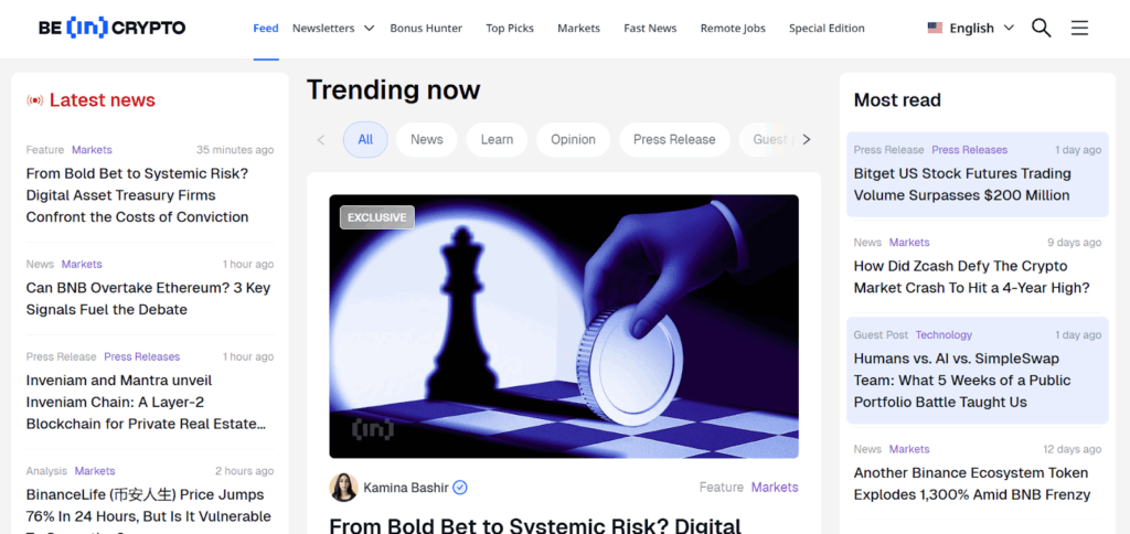 Founded in 2018, BeInCrypto, with over 2.2 million monthly visits, is a global crypto news platform known for its multilingual coverage and commitment to transparency. It offers a mix of breaking news, educational content, interviews, and market analysis tailored to both beginners and professionals.