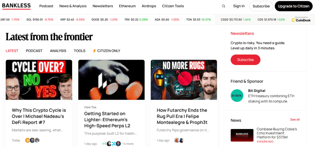 Founded in 202, Bankless, with over 1 million monthly visits, is a media and education platform focused on helping users “go bankless” by embracing decentralized finance and Web3 tools. It offers newsletters, podcasts, and long-form essays that explore Ethereum, DAOs, DeFi, and digital sovereignty.