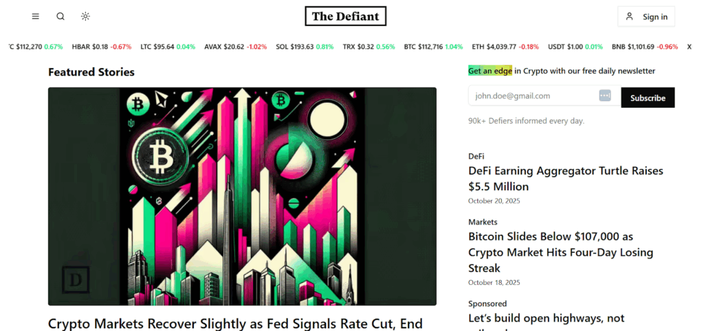 The Defiant offers editorial independence and deep DeFi expertise, with DeFi-first coverage and strong alignment with Ethereum. It is extremely influential among developers, DAO members, and DeFi investors, and its strengths include;