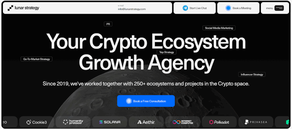 Overview: Lunar Strategy specializes in crypto and NFT go-to-market, PR, social, and influencer strategies. Apart from this, it uses “Yap” creator campaigns for NFT and crypto campaigns.