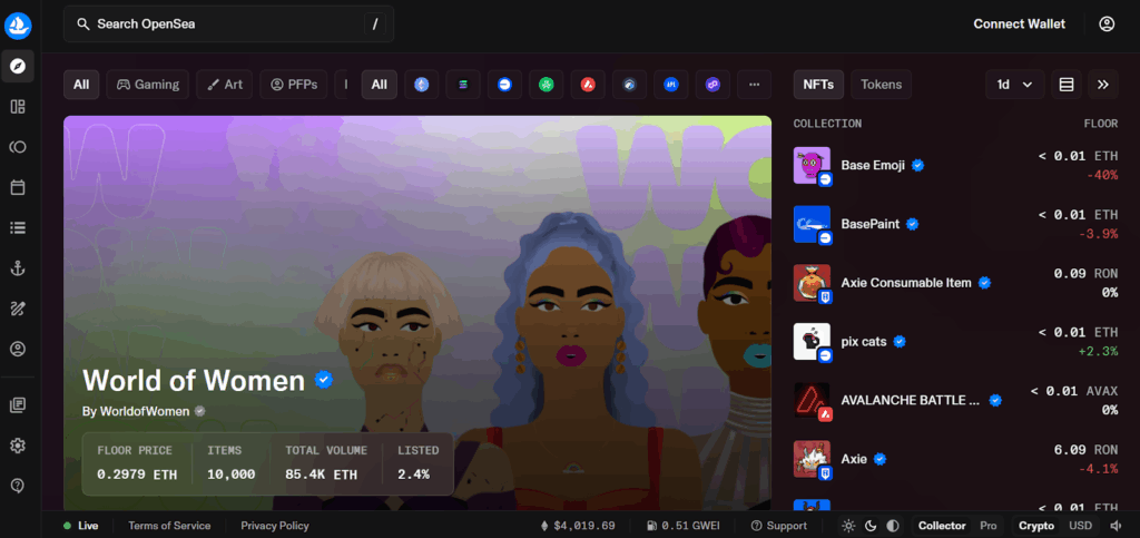 OpenSea offers seamless listing and trading after minting, supporting wallets such as MetaMask, Coinbase Wallet, and WalletConnect. You can use ETH, WETH, USDC, DAI, SOL, and other cryptocurrencies for payments on it. It doesn’t support fiat directly, but MoonPay integration is available.