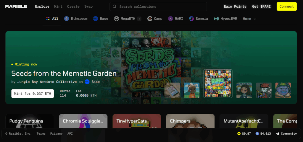 Found in 2020, Rarible is a decentralized NFT marketplace and minting platform that empowers creators with multi-chain support, customizable royalties, and community-driven governance.