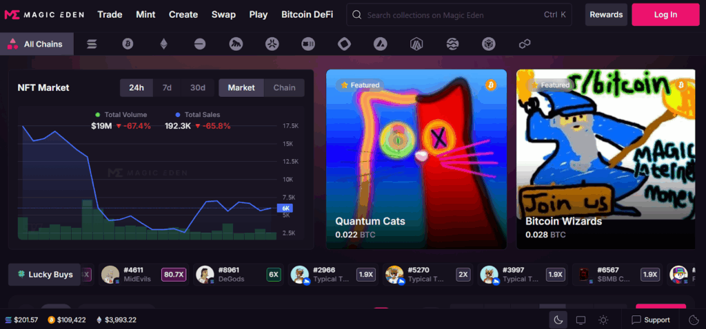 Magic EdenCreators, artists, and Web3 brandsSolana, Ethereum, Bitcoin Ordinals, and Polygon<$0.01 per NFT and 2% on secondary salesIndustry-leading Solana marketplace, fast transaction speeds, low fees, strong analytics, and rarity tools