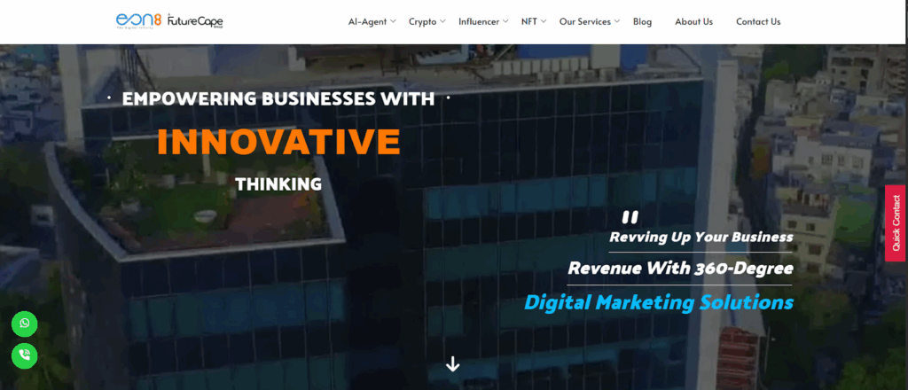 Eon8Specialized services: Crypto marketing (ICO, IDO, IEO, STO marketing), NFT marketing, Discord and Telegram community marketing, influencer marketing, AI agent development, AR/VR brand innovation, and metaverse solutions