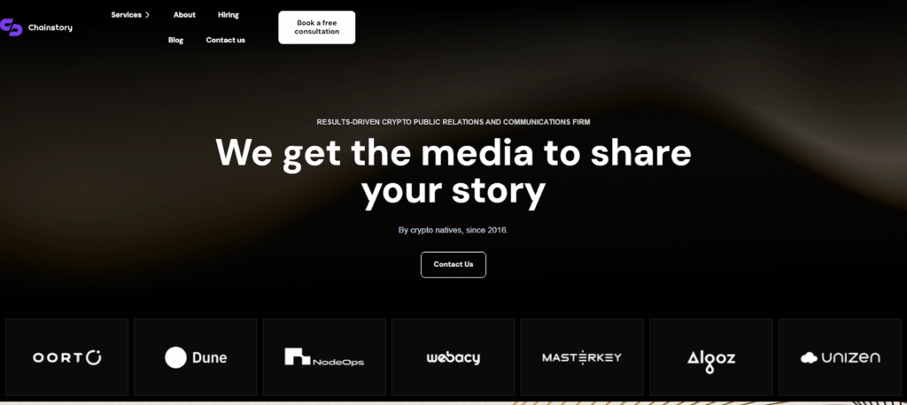 Chainstory specializes in PR, strategic messaging, media communication, content marketing, and SEO. Founded in 2016, the agency helps crypto and Web3 industries build digital presence, craft clear and compelling narratives, and gain a competitive advantage in the market.