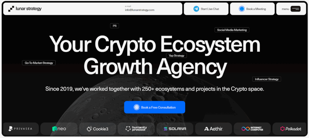 Lunar Strategy has been a full-service marketing agency in the blockchain and crypto sector since May 2019. The agency assists businesses with go-to-market strategies for new projects and provides services such as social media marketing, PR, influencer outreach, and community management.