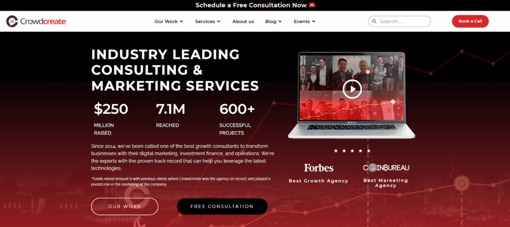 CrowdcreateIrvine, California, USAInfluencer marketing, crypto marketing, social media marketing, outreach, PR, networking, website design and development, strategic partnerships, investor marketing, sales and lead generation, video production, paid media ads, content writing, events, and conferencesRecommended for start-ups and established businesses across multiple industries to increase sales, acquire new customers, grow their online community, or leverage influencer and investor networks