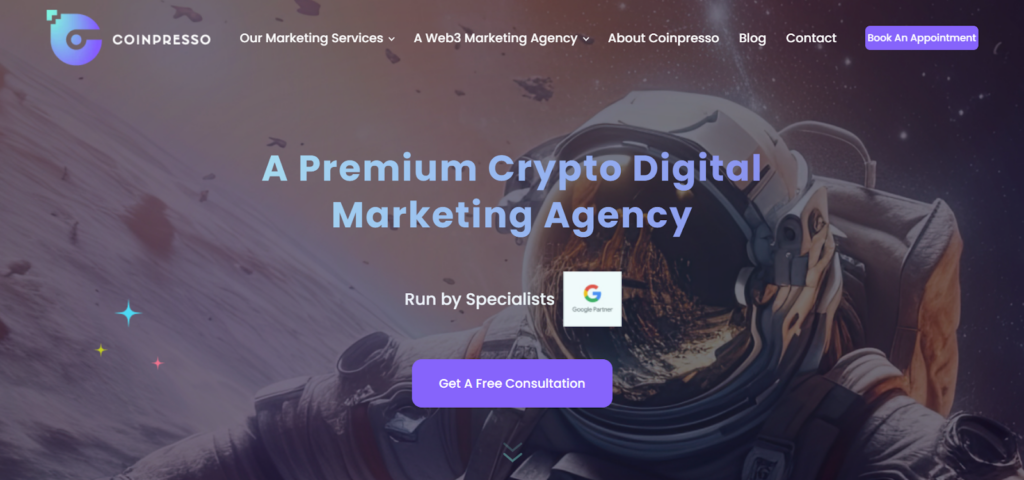 Coinpresso is a highly exclusive crypto performance marketing firm that combines expertise in PPC with a strong grasp of the Web3 industry. Their team is characterized by technical perfection and sophisticated conversion rate optimization.